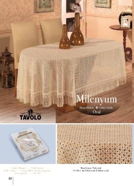 Milenyum Masa Örtüsü s Table Cloth Oval İçerik / Material ......... %100 Polyester Masa Örtüsü / Tablecloth Renk / Color ......... Cream , White , Powder , Cappucino Ø 220cm. s Ø 260cm. s Ø 300cm. (oval) Gramaj (g/m2 ) ........ 160 ± %5 40