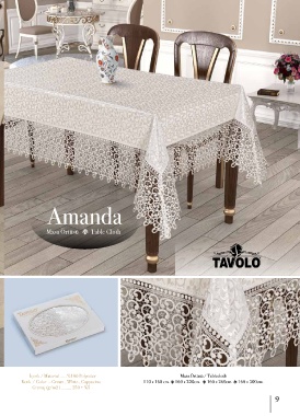 Amanda Masa Örtüsü s Table Cloth İçerik / Material ......%100 Polyester Masa Örtüsü / Tablecloth Renk / Color ...Cream , White , Cappucino 110 x 160 cm. s 160 x 220cm. s 160 x 260cm. s 160 x 300cm. Gramaj (g/m2 ) ........ 250 ± %5 9