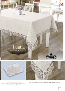 Tuana Masa Örtüsü s Table Cloth İçerik / Material ......%100 Polyester Masa Örtüsü / Tablecloth.....140 x 180cm. s 160 x 220cm. s 160 x 300cm. Renk / Color ...Cream, Powder, Cappucino , Light Green Gramaj (g/m2 ) ........ 200 ± %5 15